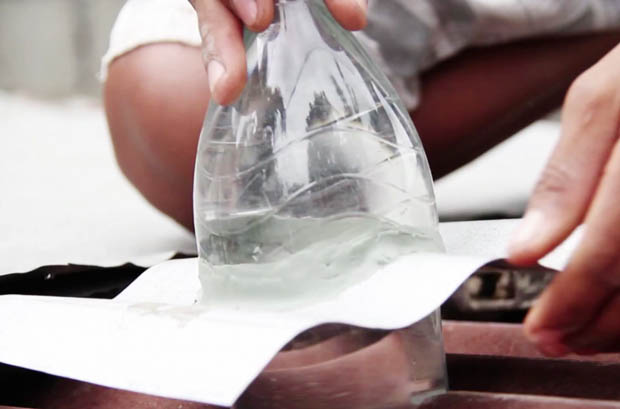 2. ทำการใส่น้ำให้เต็มขวด เพราะน้ำ เป็นปัจจัยสำคัญที่จะทำให้แสงสว่างเกิดขึ้นได้ หากต้องการแสงที่สว่างมากที่สุด ก็เป็นน้ำผสมน้ำยาฟอกขาวด้วย (Bleach) หรือ คลอรีน และหากคุณต้องการให้มีสีสันหละก็ อาจใช้น้ำผสมสีที่ต้องการ ก็ได้เช่นกัน เมื่อใส่เต็มขวดแล้ว ทำการปิดฝาให้สนิท จากนั้นก็ทำการติดตั้งร่วมกับแผ่นหลังคาได้ทันที