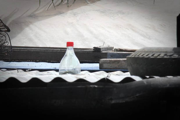 1. เตรียมขวดน้ำ ขวดพลาสติก ที่ต้องการ มาวัดขนาดร่วมกับแผ่นเศษหลังคา ในที่นี่ แนะนำให้เป็นหลังคาบ้านที่เป็นสังกะสี หลังคาไม้สาน มุงจาก หรืออื่นๆ ส่วนแผ่นกระเบื้องนั้นอาจทำได้ยาก แต่หากสามารถทำการเจาะแผ่นหลังคากระเบื้องได้ ก็สามารถทำได้เช่นกัน เมื่อได้ขนาดที่ต้องการ ทดสอบสวมใส่ขวดเข้าไป ติดให้แน่นตรงขอบขวด ส่วนเชื่อมต่อระหว่างแผ่นหลังคากับขวด
