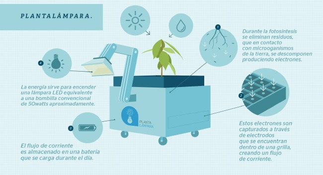 โดยโคมไฟพลังงานพืช ซึ่งเป็นผลงานของ UTEC (มหาวิทยาลัยวิศวกรรมศาสตร์และเทคโนโลยี) ถูกเรียกว่า “Plantalámpara” ถูกพัฒนาโดยการใช้เชื้อเพลิงจากสารต่างๆ ในพืช และแบคทีเรียที่พบในดิน ซึ่งสามารถปล่อยสารอิเลคตรอนออกมาได้ในระหว่างการเจริญเติบโต หรือการสังเคราะห์แสง ซึ่งเจ้าโคมไฟนี้ถูกออกแบบให้เก็บพลังงานจากพืชไว้ในแบตเตอรี่ และสามารถนำพลังงานส่งไปที่หลอดไฟ (LED) เพื่อให้เกิดแสงสว่างได้ค่ะ