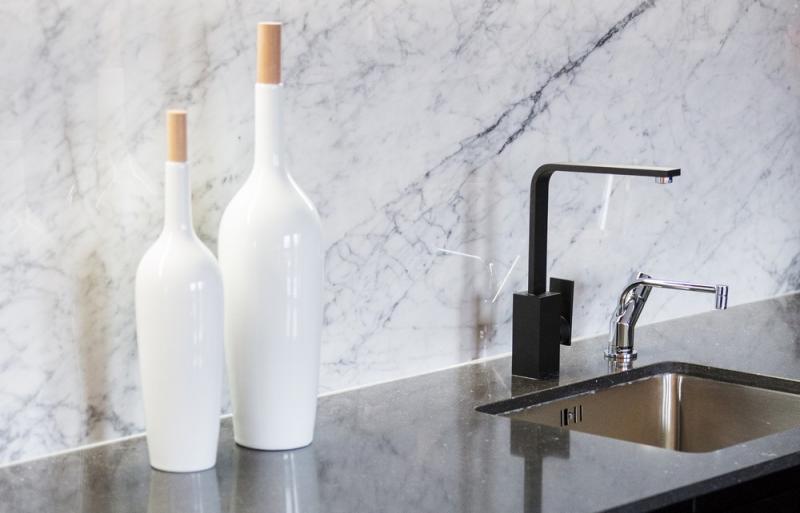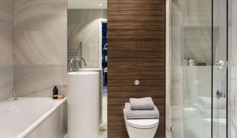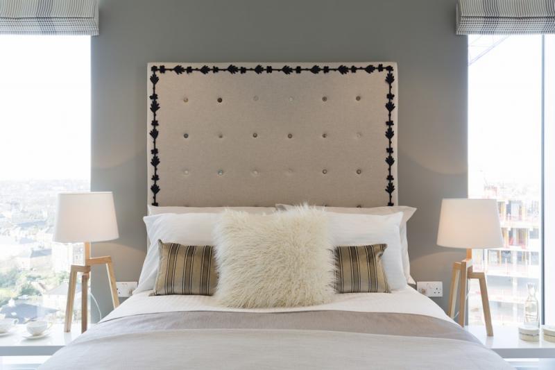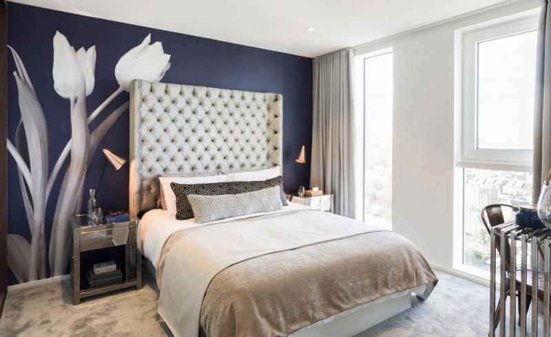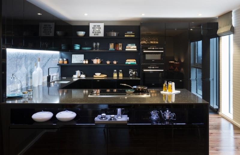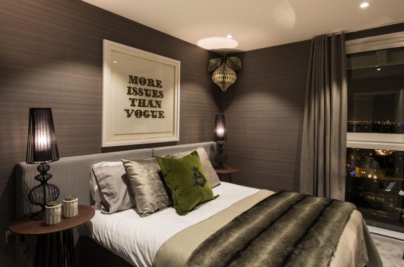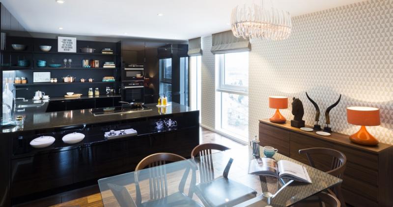 Interior designer and co-director Rebecca Tucker stated: “This was an ideal project for Suna Interior Design. We worked on the specification as well as the interior design which is quite moody and masculine with rich tones of gloss black kitchen cabinetry, walnut flooring and a marble splash-back in the elegant kitchen. We then took this design to the next level by adding tones of leather and copper.” This spacious apartment lends itself to the dynamic color palette of coppers and moody greys with added navys and green. [Photos and information provided via e-mail by Suna Interior Design]