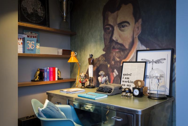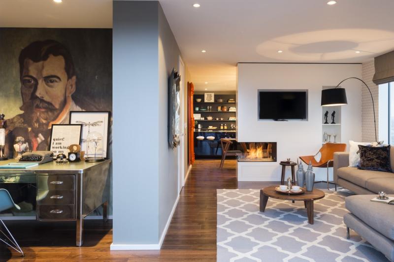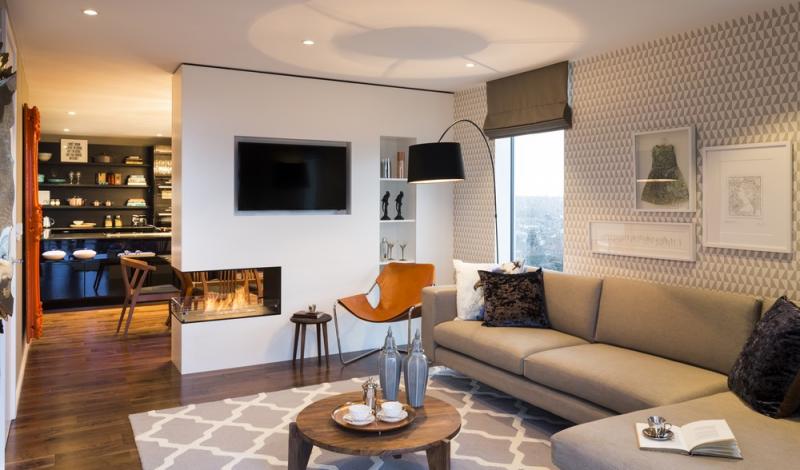 Suna Interior Design revealed photos and information regarding a three bedroom duplex apartment completed for The Filaments, a brand new residential development at the heart of a London borough. The brief of this project was to include original works of art. To this end the living room is furnished with a leather Paulistano chair, a Map Dress Artwork by Jennifer Collier and one of Jayoon Choi’s Jealous Gallery. An eclectic combination comprising warm tones of copper coupled with captivating Skandi wallpaper. The warmth of the room is captured further by the use of lux, velvety scatter cushions by House of Hackney on the bespoke sofa, the vivacious orange of the ornate mirror on the opposite wall and of course the bespoke double-sided fireplace that stylishly warms both the living and dining rooms.