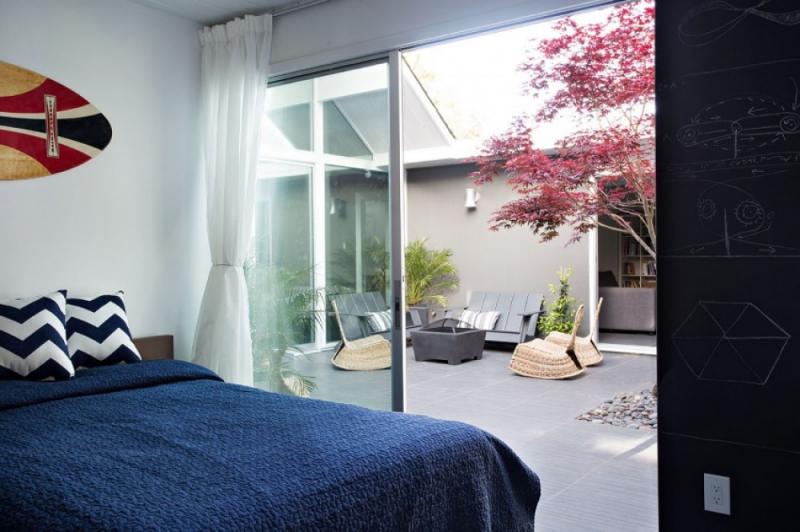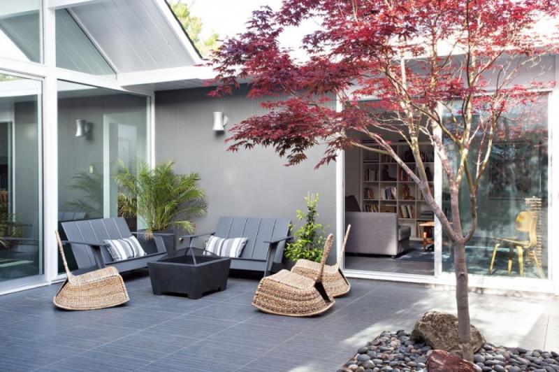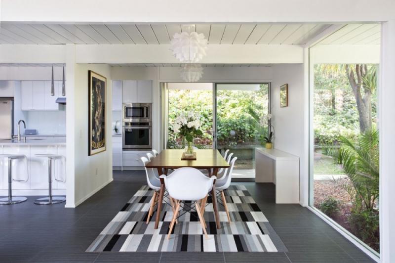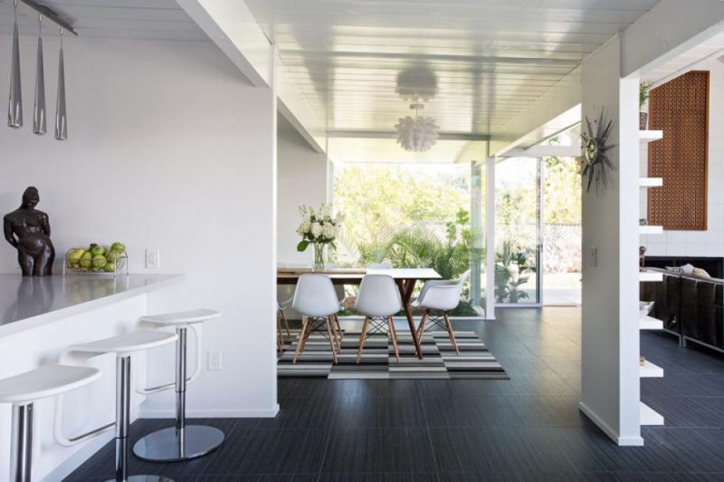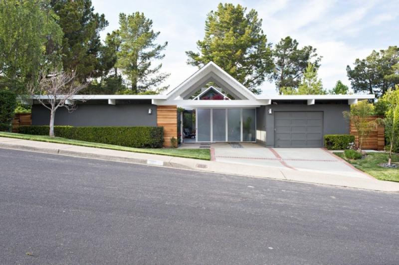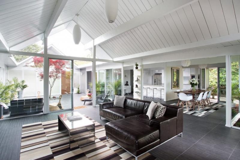 แบบบ้านชั้นเดียวท่ามกลางบรรยากาศผ่อนคลายร่มรื่นของสวน กับโครงการที่ใช้ชื่อว่า Double Gable Eichler เป็นการรีโนเวทปรับโครงสร้างแบบบ้านเก่าให้เข้ายุคเข้าสมัย โดยได้รับความช่วยเหลือจากสถาปนิก Klopf Architecture ตามความต้องการของลูกค้าคือ อยากมีบ้านในฝันหลังใหม่ให้ดูทันสมัย โปร่งสบายกว่าเดิม และผสานเฟอร์นิเจอร์วินเทจ ศิลปะดั้งเดิม และดีไซน์ทันสมัยไว้ด้วยกัน