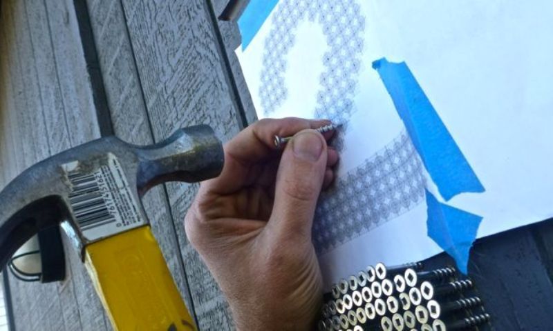 - Once you’ve printed your numbers, position the paper on your surface. Make sure they are straight and nicely laid out before hammering the nails (you can also use one of the screws like in the photo). The goal for this step is to just mark where you will drill the screws.